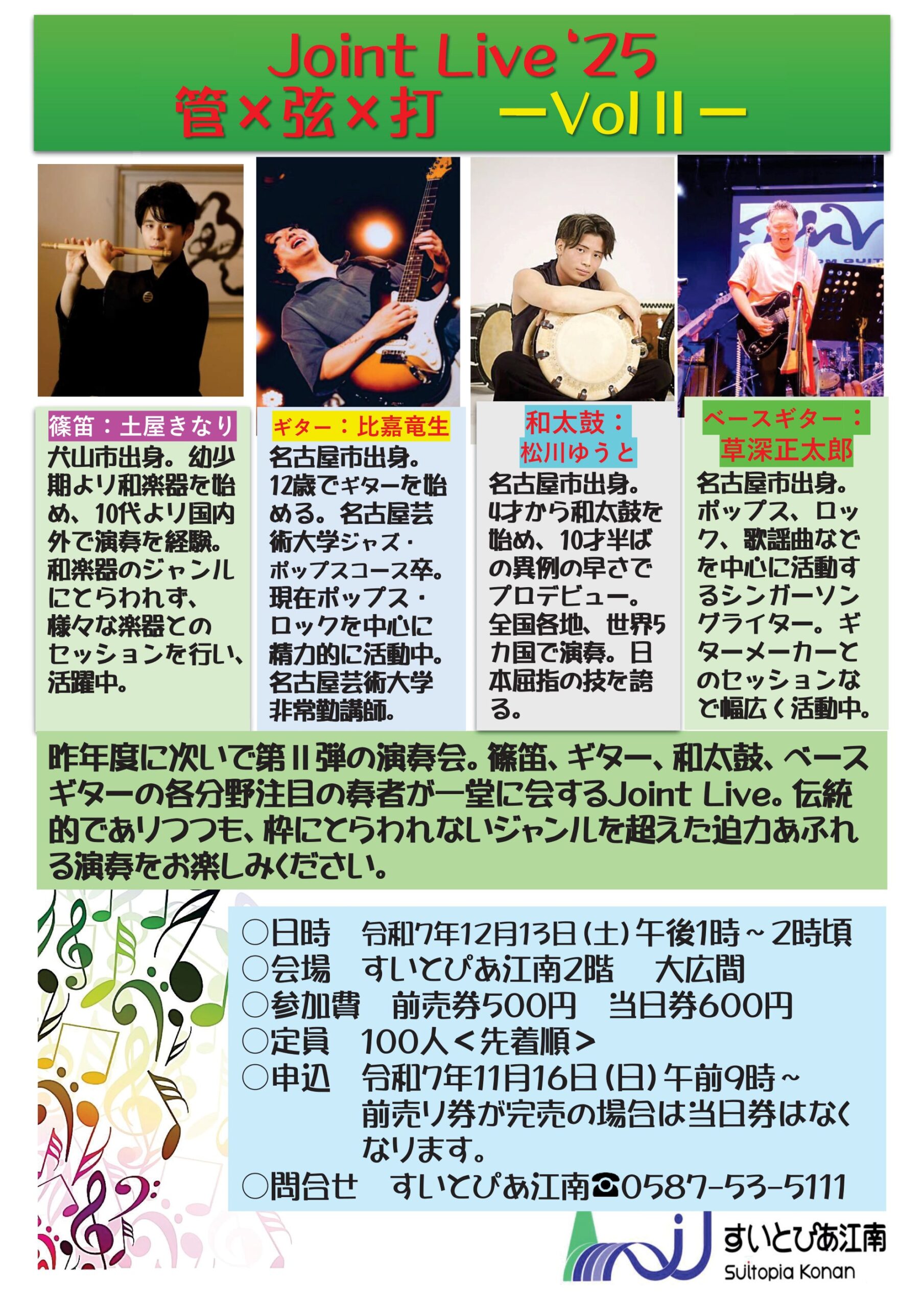 第2弾となる今回は、篠笛・ギター・和太鼓・ベースギターの各分野で注目される奏者が一堂に会し、ジャンルの枠を超えた迫力満点の演奏をお届けします。
