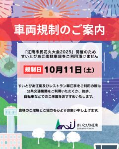 10/11(土)「江南市民花火大会」開催に伴い、すいとぴあ江南でも駐車場の規制を行います。